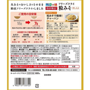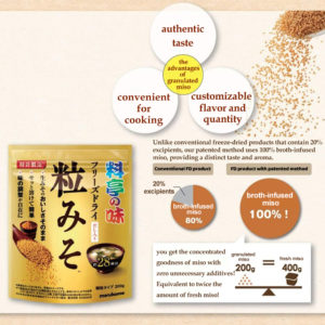 The miso is quickly freeze-dried, preserving the original flavor without any change. Packed in a convenient zip-lock bag, it can be used not only for miso soup but also in various dishes. With a patented method, this miso contains 100% broth, providing a unique taste and aroma.
